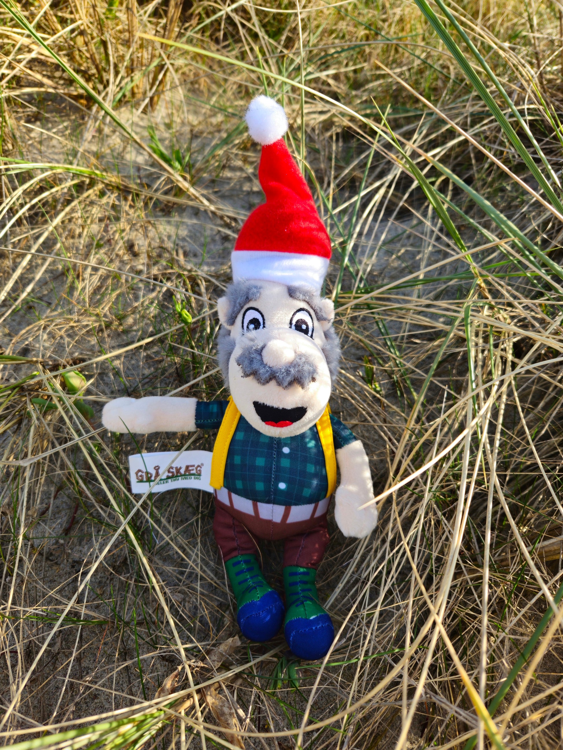GråSkæg-bamse i stof med vatfyld og med nissehue på.